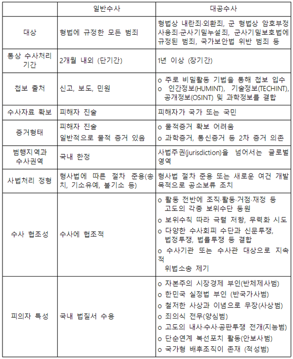 위 표에서 알 수 있는 바와 같이 일반수사의 특수 영역으로서 대공수사는 특별법으로 규정된 한정된 범죄를 수사대상으로 한다. 일반 형사수사가 주로 피해자의 신고, 민원제기와 공개된 출처를 활용하는 것과 달리 대공사건은 대부분 특수활동을 통해 수사첩보를 발굴하거나 증거를 수집하게 되며, 미래 활용가능성에 따라 사법처리 방향이 달라지는 등 특성을 가지고 있다. 따라서 담당 수사관의 경륜과 전문성이 사건 성패를 좌우할 수 있다. 특히 간첩수사는 물리적 증거를 확보하기 어렵다. 고도의 기밀성을 가진 통신 수단과 암호화된 네트워크(다크웹)에서 활동하기 때문에 범죄를 추적하는 것도 매우 어렵다. 사건을 해결하는데 최소 1년에서 십 수년간 지속적으로 노력을 기울여야 한다. 특히 이들의 배후에는 활동지식, 자금, 기술 및 장비를 지원해 주는 국가 형태(이른바 북한이 이에 해당한다)가 배후 조직이 있기 때문에 수사기관 못지않은 활동수준을 구비하고 있다. 이를 극복하기 위해서 국가 수사기관은 고도의 전문성과 기술력을 갖춘 인적자원은 물론 물리적으로 수사활동을 뒷받침해 줄 수 있는 특화된 조직체계를 갖추어야 한다.