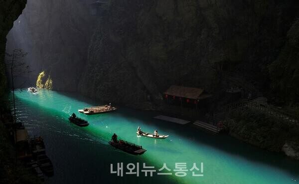 초겨울 정오 무렵, 후베이(湖北)성 언스(恩施)투자(土家)족먀오(苗)족자치주 허펑(鶴峰)현 핑산(屏山)협곡에 햇살이 비치면 맑은 물 위를 떠가는 배가 마치 공중에 떠 있는 듯한 착시를 일으키며 아름다운 풍경을 연출한다. 24일 핑산협곡에서 배를 타는 관광객을 드론에 담았다.내외뉴스통신, NBNNEWS
